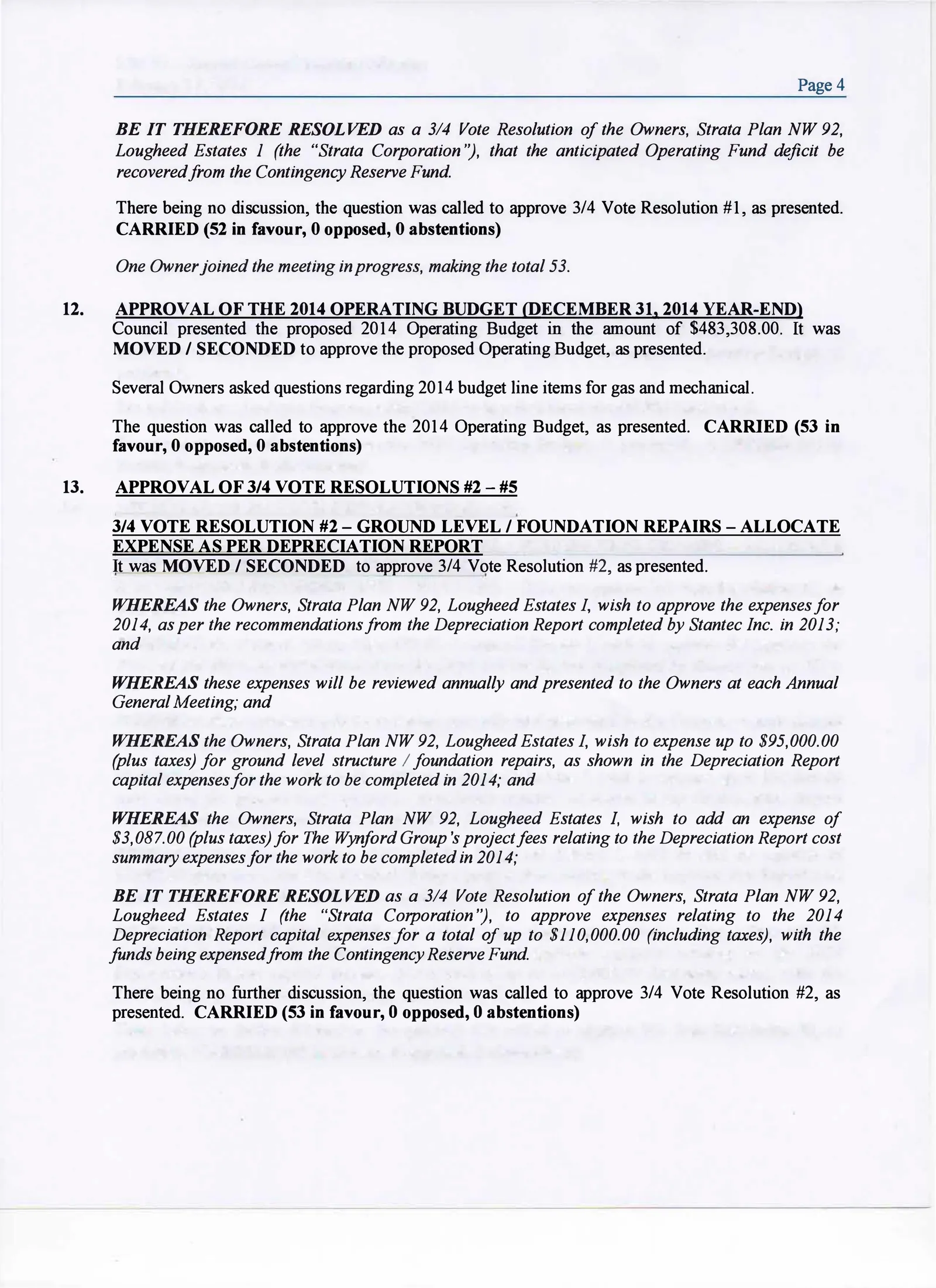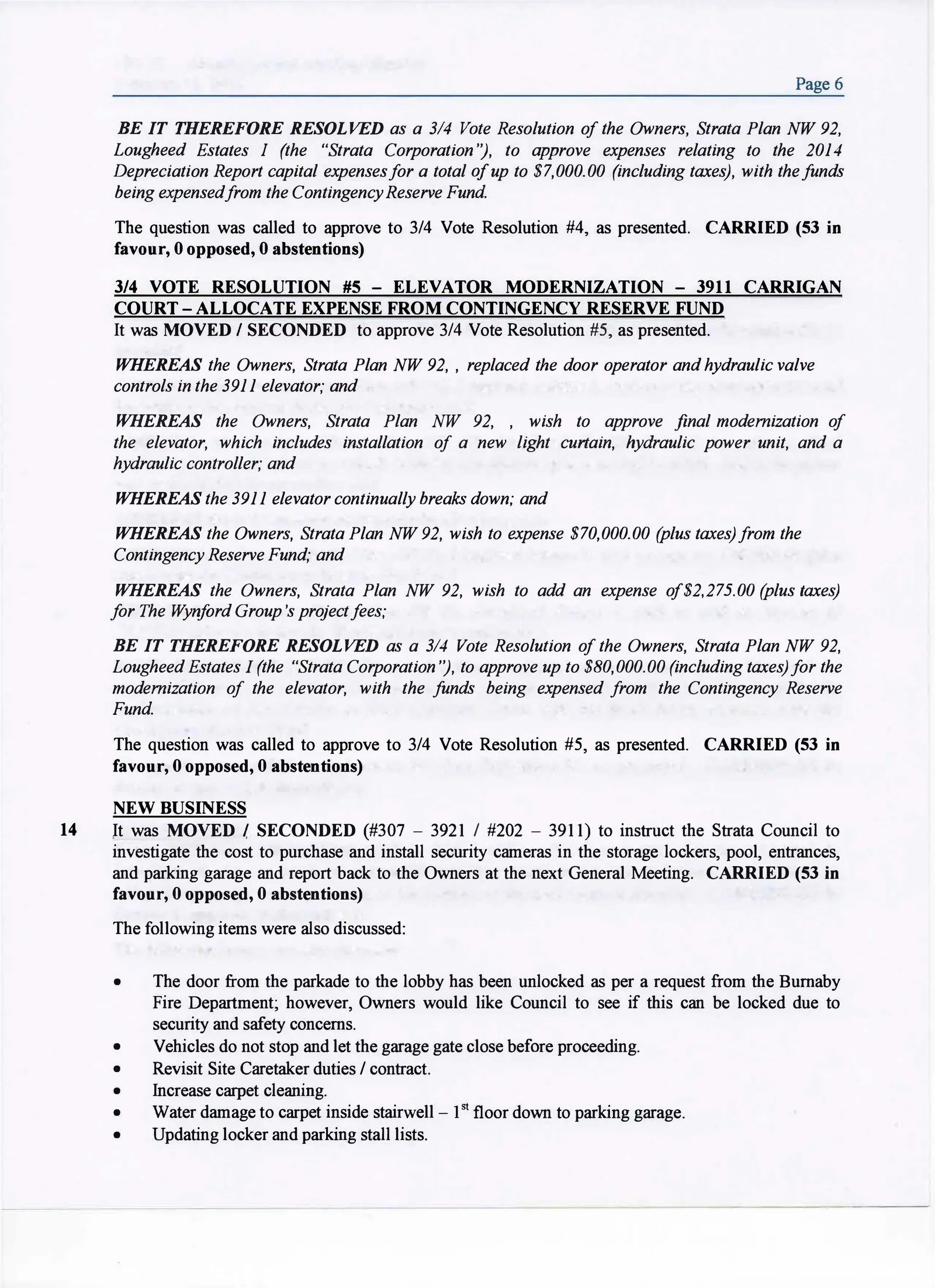 Minutes from strata council and general meetings, describing building decisions, repairs, levies, and financial concerns.